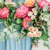 The tablescapes are full of items provided by the Vintage Barn and include lanterns, candles, pillar candles, votive candles, and more. Whitney and Erik also added eucalyptus garland down the center of the bridal party table. The bridal party table was a wooden farmhouse table, which I always love!